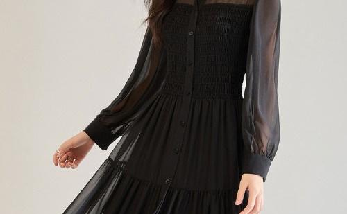 軽やかなブラックシフォンロングワンピースは、これからの季節や夏のデートやリゾートシーンにぴったり。透け感のある生地が女性らしさを引き立て、ティアード調が美しく、それでいて妖艶。