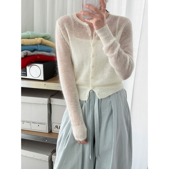 シンプルなラウンドネックの定番デザインと、シアーなモヘア素材が、大人のトレンドスタイルに丁度良いカーディガン。