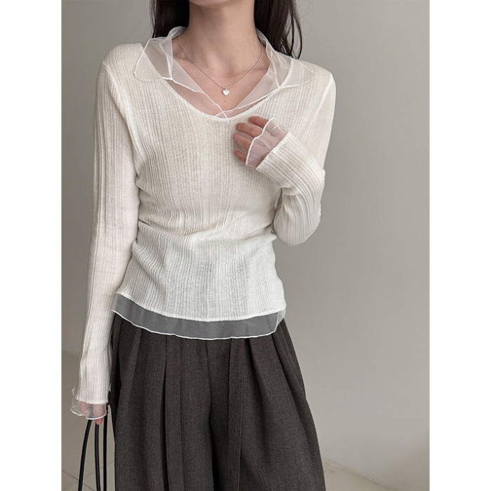 シアーシフォンのシャツディテールが遊び心あるリブのカットソー。
