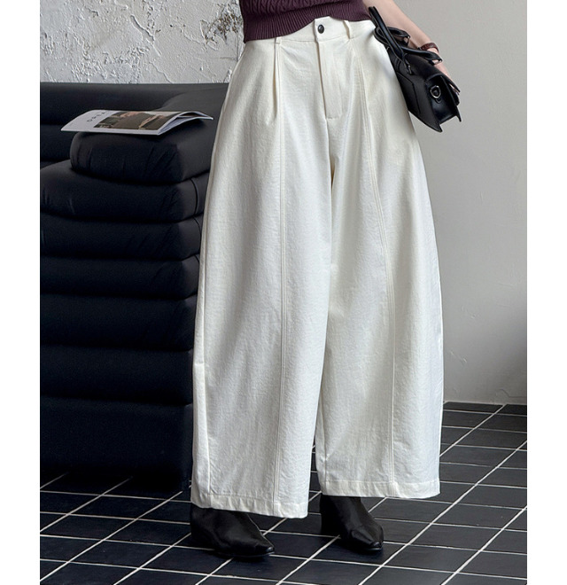 ややハリのあるポリエステル素材で、足の形を拾わないワイドパンツ。