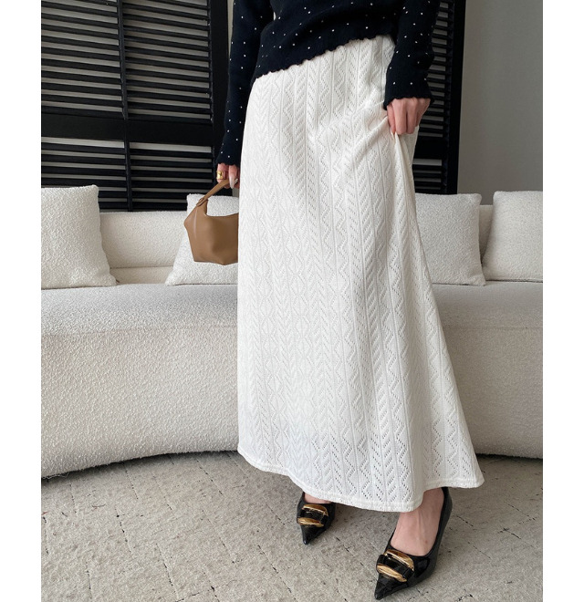レース編み生地のAラインスカート。上品な透け感でロング丈でも軽やかな印象ですね。