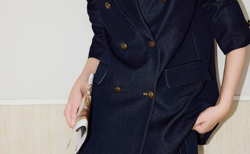 デニムでありながらカジュアルになりすぎないのは、ダブルブレストのジャケットとゴールドボタンが生み出す、凛とした佇まいがあるから。