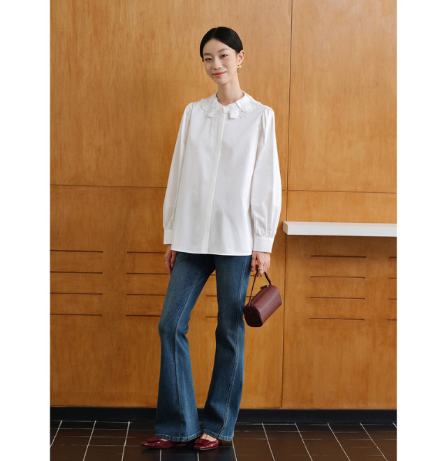 デニムの中でもフレアシルエットを選んで、トレンド感のあるカジュアルに。レースカラーが程よい女性らしさをプラスし、休日のお出かけコーデを格上げします。