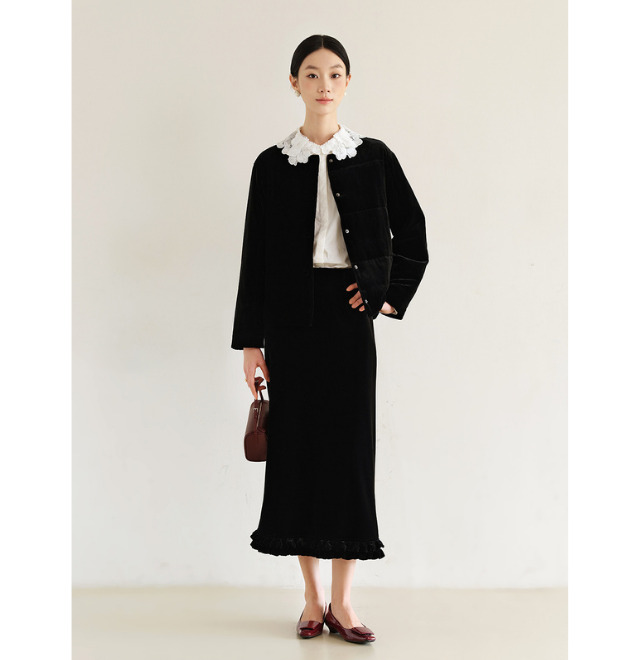 ブラックのベルベットセットアップのインナーとして。白のレースカラーが顔まわりを明るく見せ、大人のエレガントスタイルを完成させます。