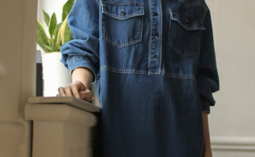 下半身はすっきりとしたIラインシルエットのデニムワンピース。
