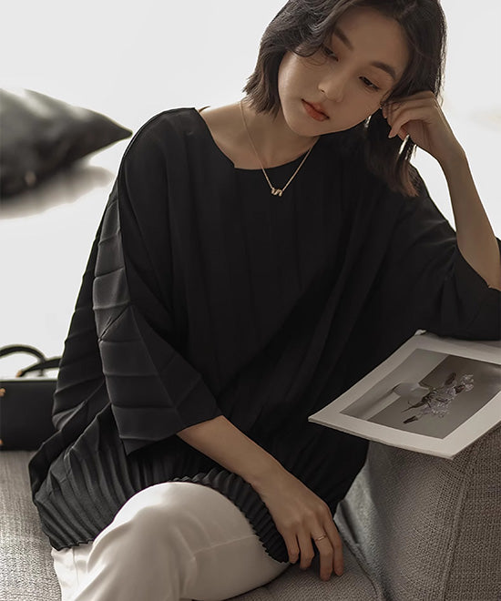 胸元から流れるようにプリーツが入ったブラックブラウス。