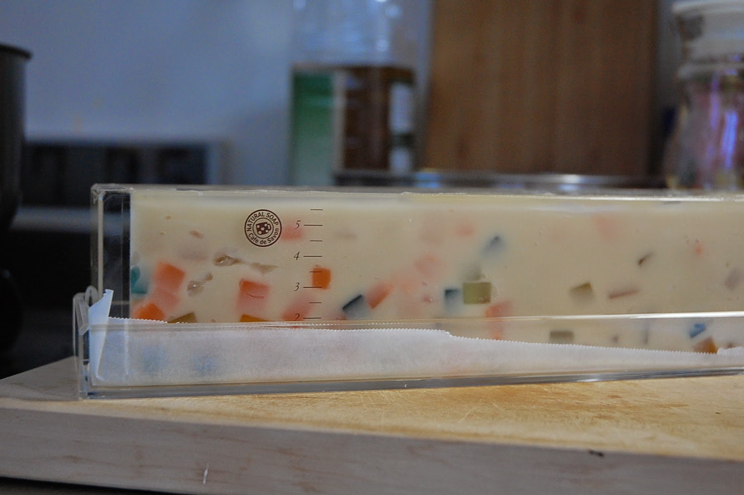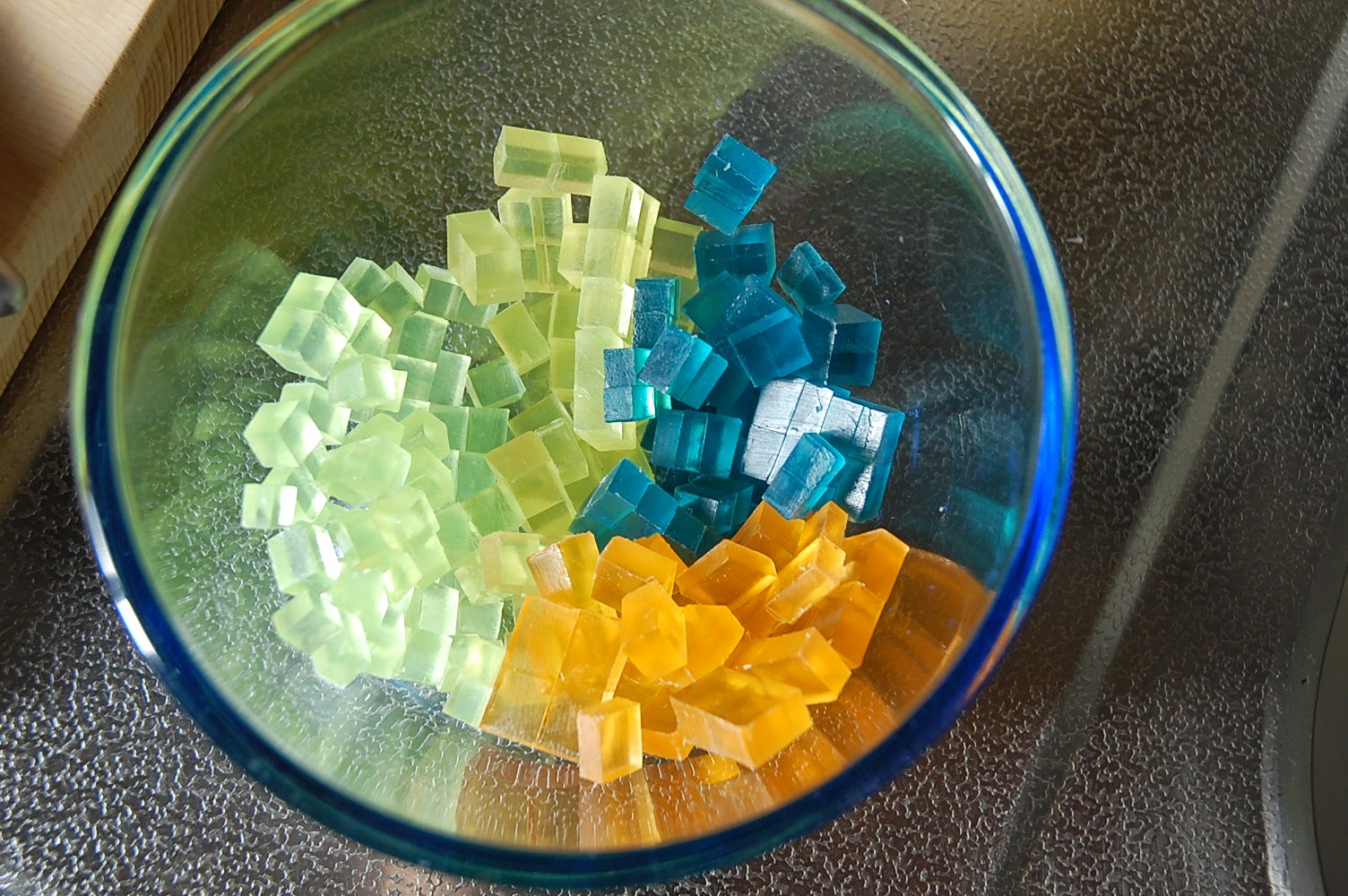 いろいろな色でグリセリンソープを作り、切ったものをまたさらにグリセリンソープの中に入れ込み、美しい柄を作ります。