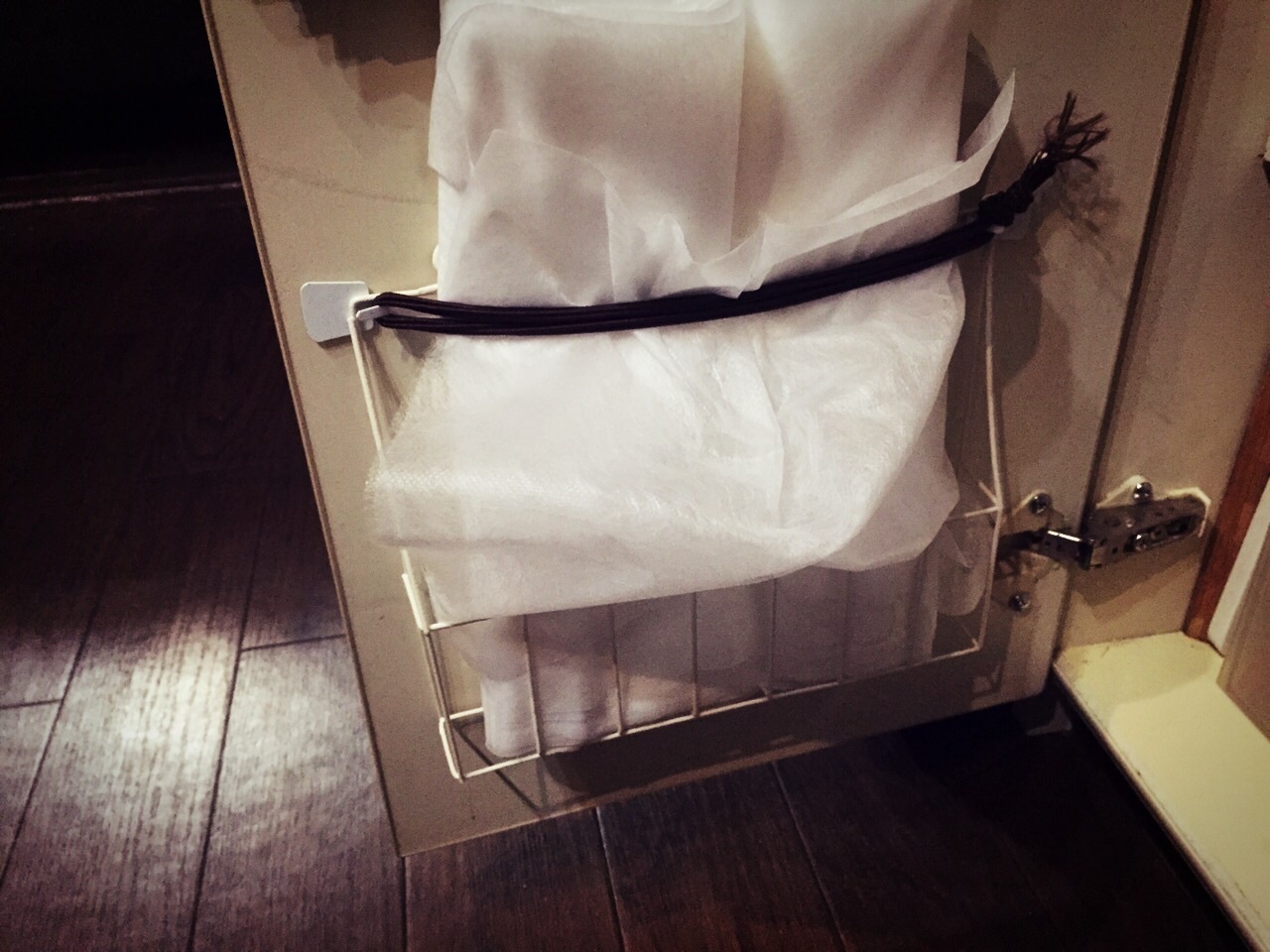 レターラックにゴムを組み合わせて排水口ネットの収納に活用♡